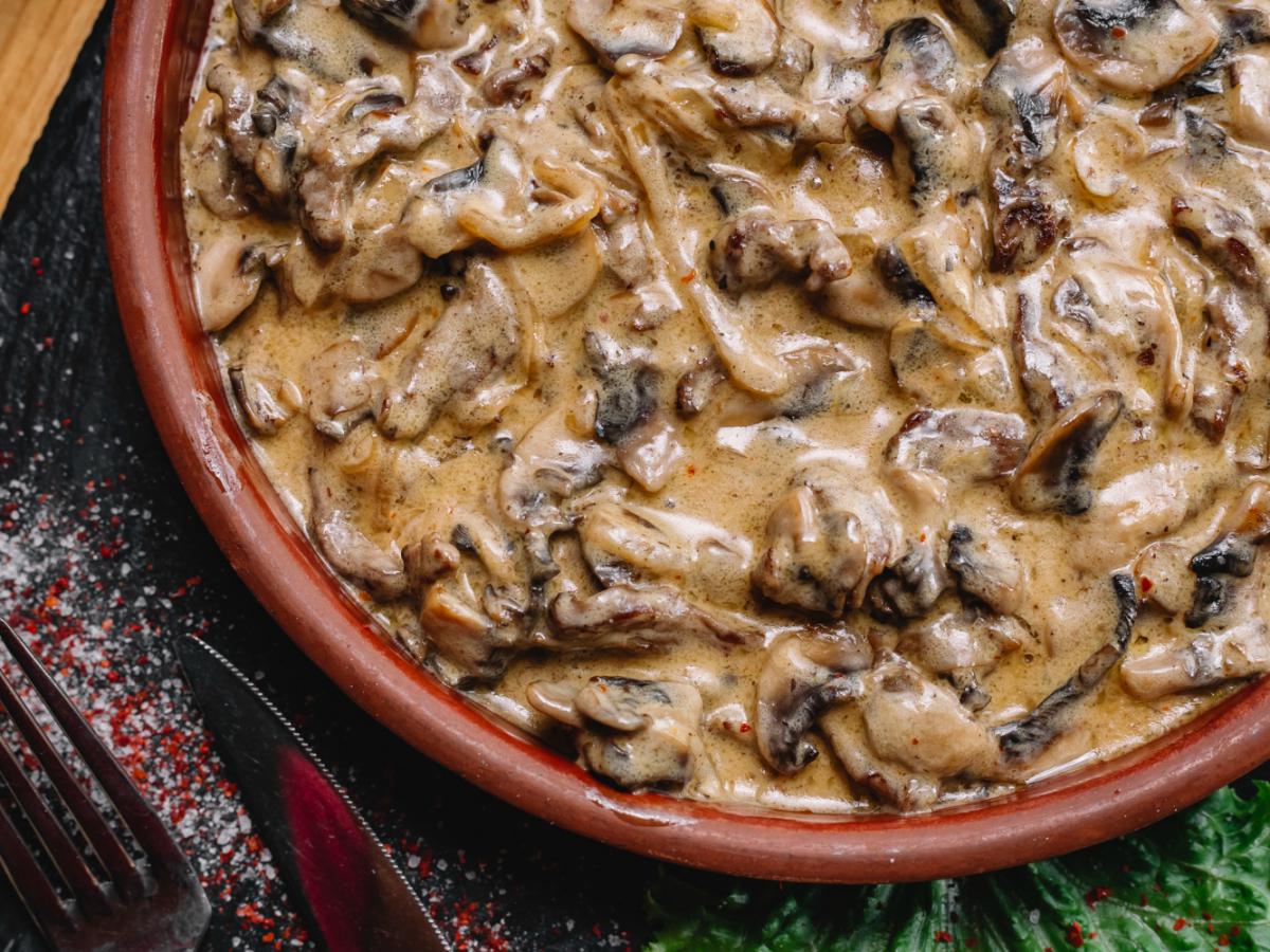 Смешайте крахмал с водой, соедините со сметаной. Посолите, поперчите, добавьте прованские травы. Влейте соус в сковороду.