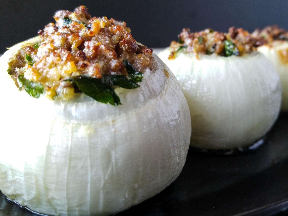 Это блюдо не просто красиво смотрится на тарелке — оно ещё и отлично сочетается почти с любыми основными блюдами, будь то мясо, рыба или овощи. Луковые "чашечки" с аппетитной начинкой из бекона, сыра и хлебных крошек станут ярким акцентом на вашем столе.