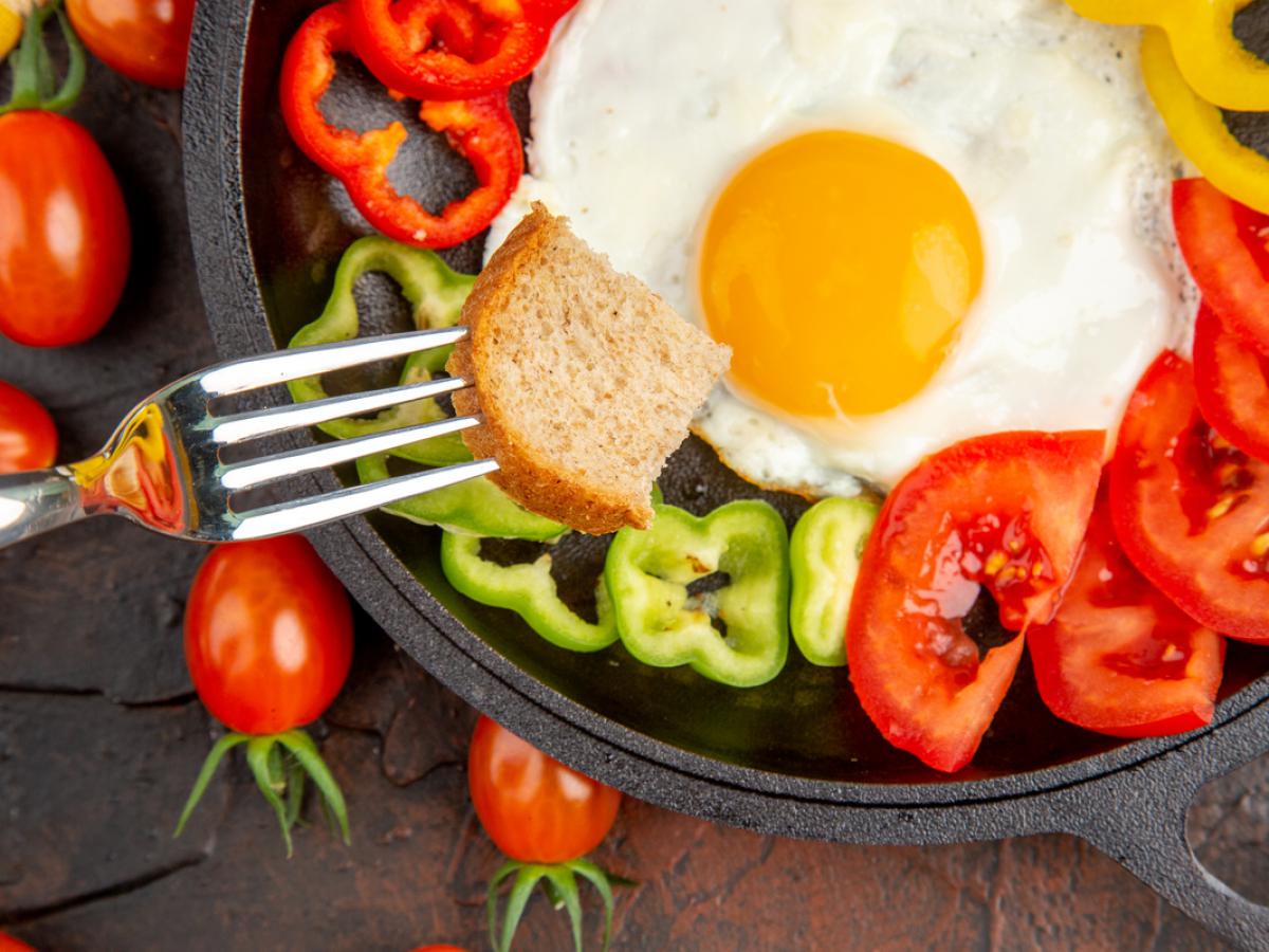 Яичница должна стать плотной, но не "резиновой". Если не схватилась — дайте ещё 10 секунд.