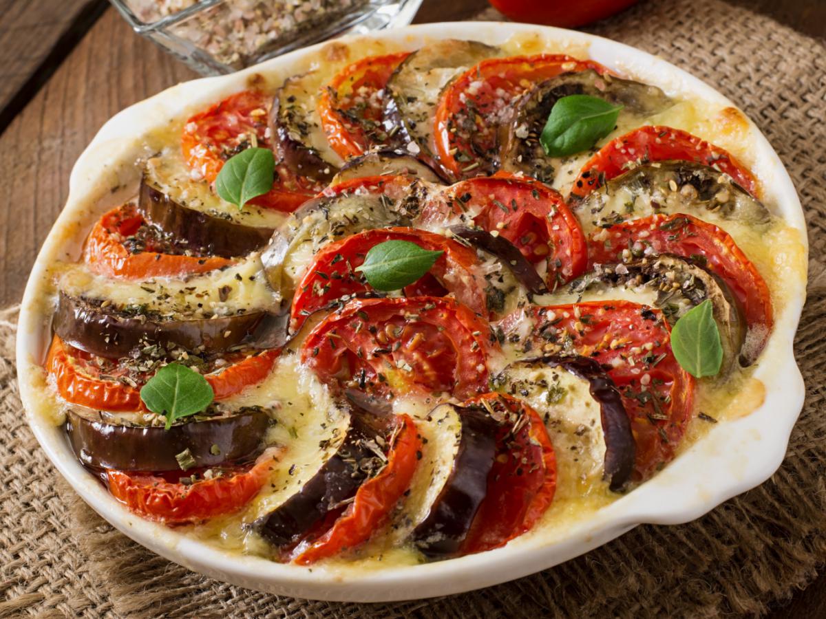 Выложите всё в форму. Сверху — баклажаны и помидоры внахлёст.
