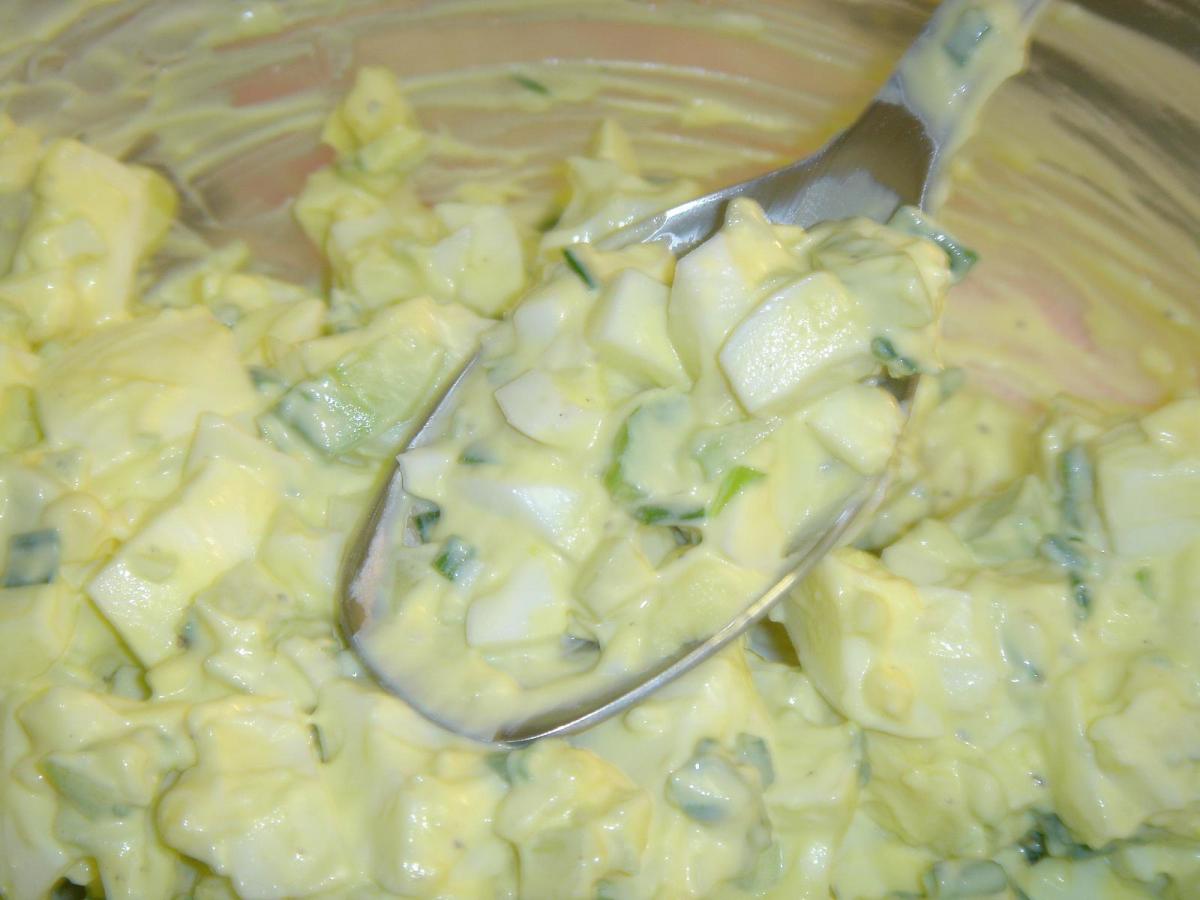 Отварите яйца вкрутую, остудите и нарежьте кубиками.