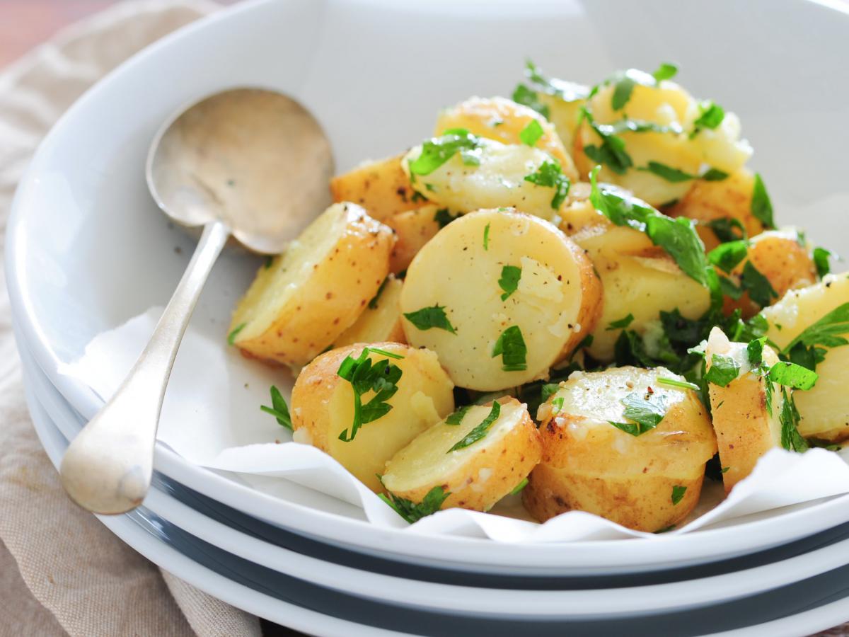 Когда картофель еще теплый, в него вмешивают свежие травы. Петрушка, укроп, зеленый лук — всё раскрывается ярко, наполняя блюдо ароматом лета. Итог — сочный, пряный, слегка хрустящий салат, который хорош и горячим, и чуть остывшим.