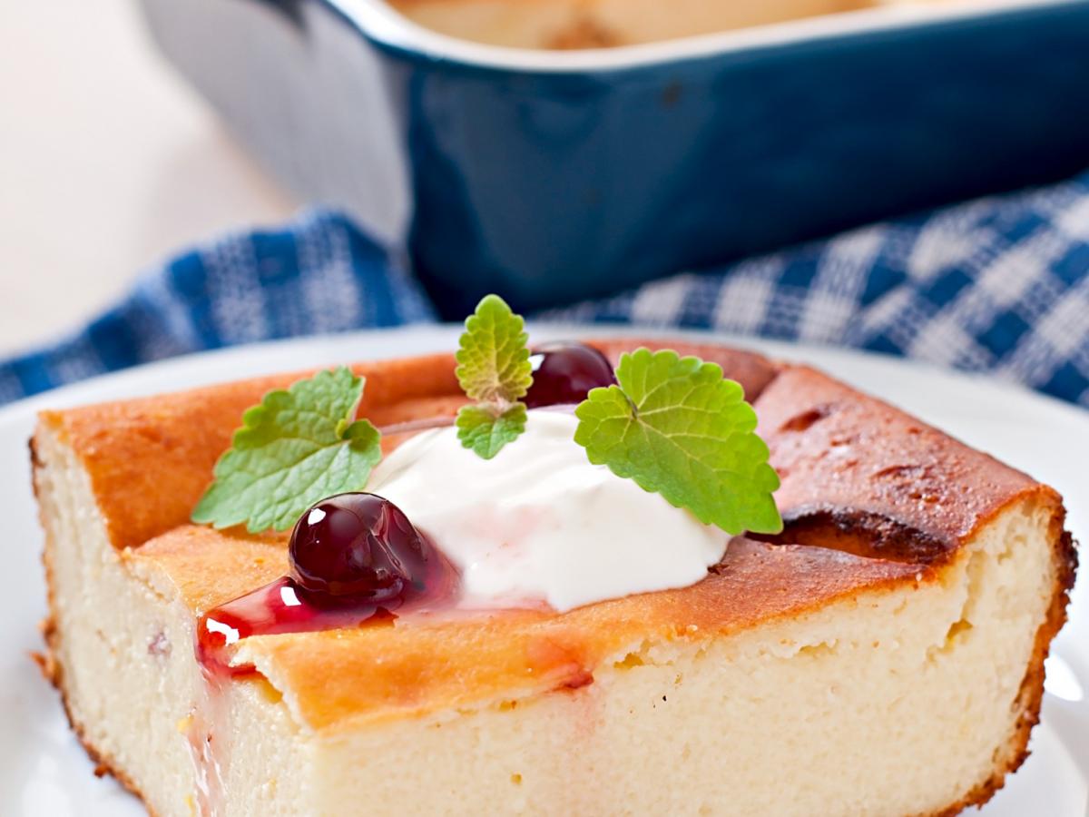 Запеканку остудить хотя бы до тёплого состояния — она станет плотнее и легко нарежется. Подавать с ягодами, фруктами, сметаной или сгущёнкой.