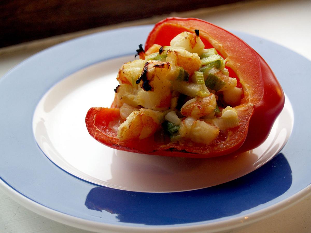У перцев срежьте верхушки, удалите семена. Наполните их остывшей начинкой.