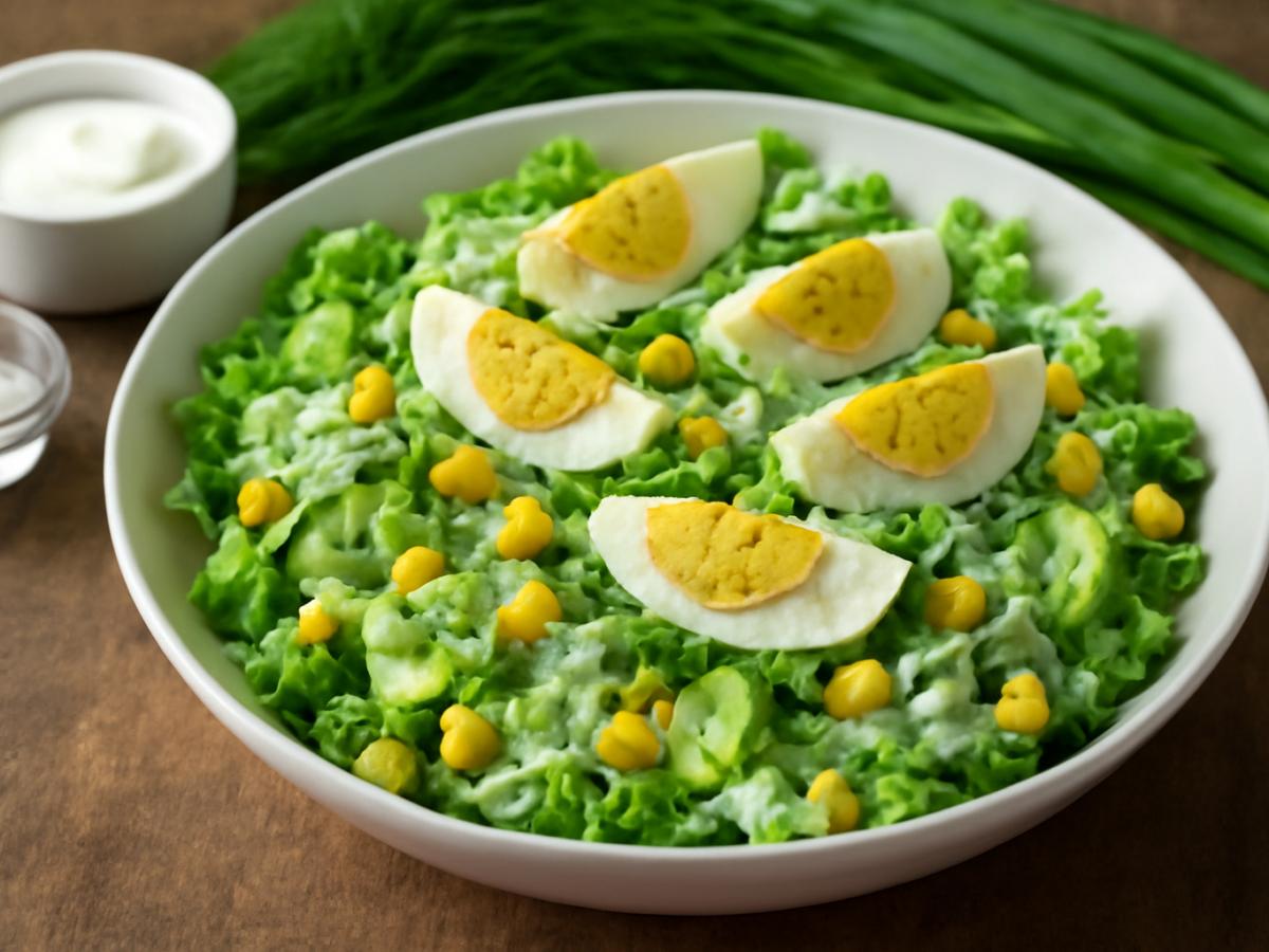 Кукуруза привнесет в этот свежий салат особую текстуру и красивый желтый цвет, а вареные яйца с сметаной в качестве заправки объединят все ингредиенты, придавая блюду насыщенности. Добавьте черный перец и другие специи по своему вкусу. Идеально подойдут любые свежие зелень и салатные листья, которые можно найти на огороде.