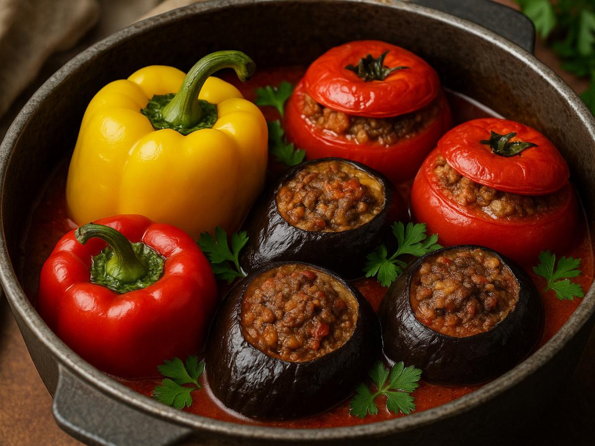 Это блюдо — находка для большой семьи или дружеского застолья. Фаршированные овощи выкладываются слоями в кастрюлю, где тушатся в насыщенном овощном соусе. Можно использовать любое мясо, но мы взяли баранину, пропустили через мясорубку и добавили в фарш отварной рис. Получилось сочно, ароматно и по-домашнему уютно.
