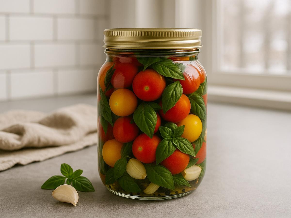 Если хочется заготовить что-то по-настоящему необычное, обратите внимание на эти ароматные солёные помидорчики. Не просто черри, а черри с базиликом и чесноком — с пикантным вкусом, ярким ароматом и освежающей пряностью.