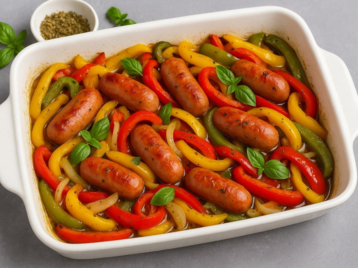 Сверху выложите сосиски. Запекайте 40–45 минут при 200 °C, пока перец и лук не станут мягкими, а сосиски — румяными.