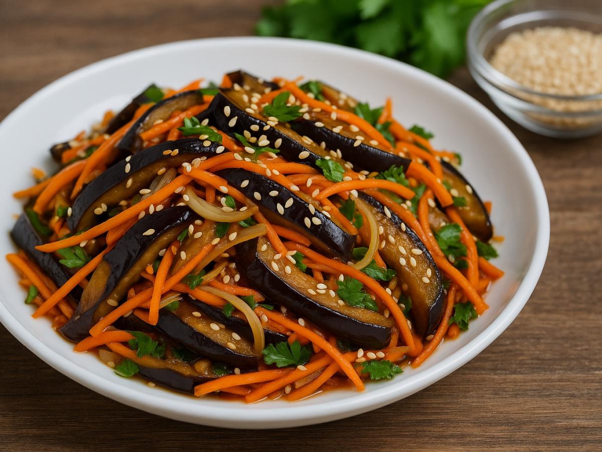 Эта закуска способна украсить как повседневный стол, так и праздничное меню. Баклажаны по-корейски готовятся быстро, а продукты для них — самые простые. Из специй понадобятся кунжут, молотый кориандр, хлопья красного перца, соевый соус и уксус. Для свежести — кинза (при желании можно заменить петрушкой).