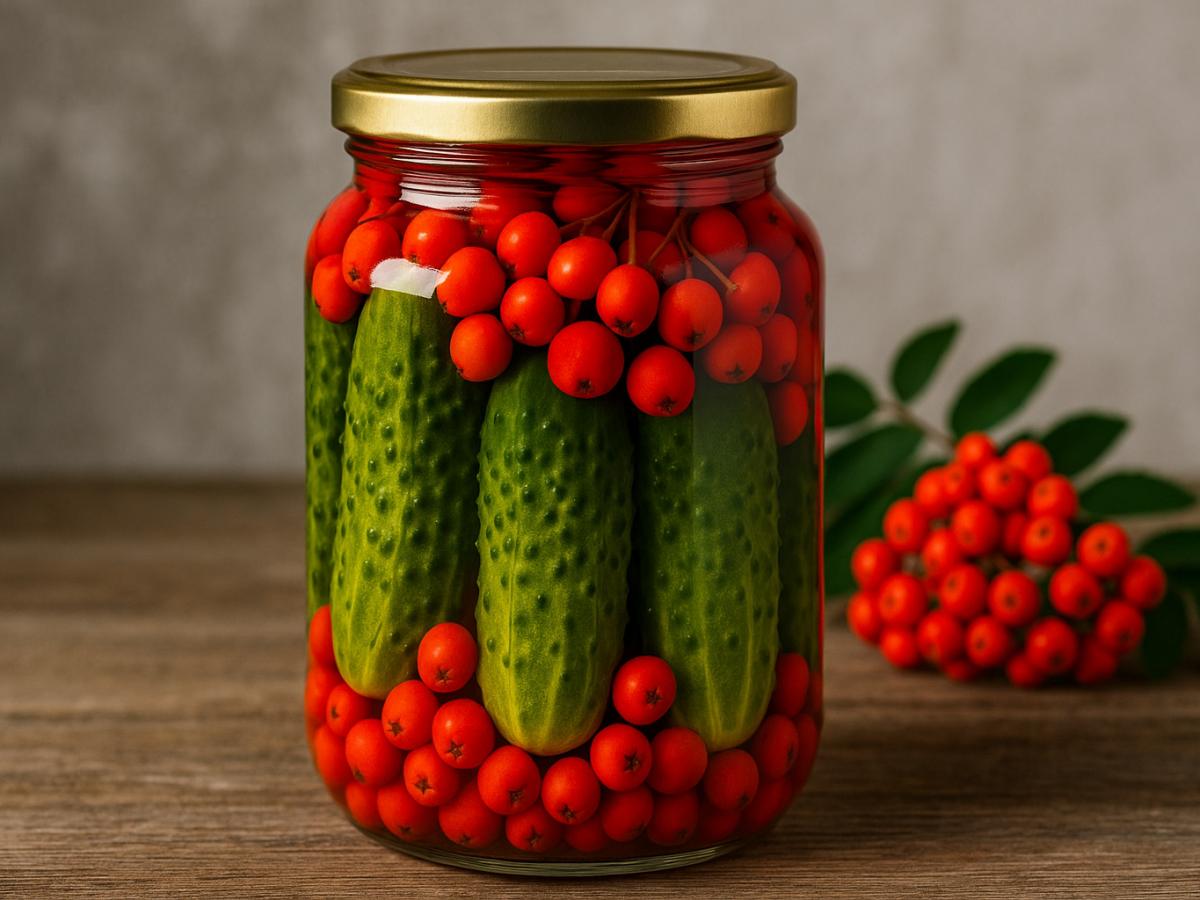 Нейтральный вкус огурцов идеально сочетается с терпкой рябиной. Ягоды добавляют легкую пикантную горчинку, а вместе с маринадом превращают овощи в необычную и очень интересную закуску. Достаточно разложить рябину между плотно уложенными огурцами, залить рассолом, закатать и оставить банку до полного остывания. Из указанного количества продуктов получается одна 0,5-литровая банка.