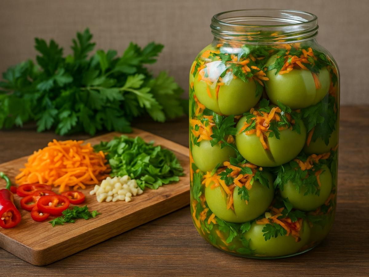 Зимой на праздничном столе всегда хочется чего-то особенного. И фаршированные зеленые помидоры — именно та закуска, которая удивит гостей своим пикантным вкусом. Они получаются в меру солёными, с лёгкой кислинкой и невероятно свежим ароматом. А ещё - очень полезными: ведь все овощи остаются сырыми, сохраняя витамины и пользу.