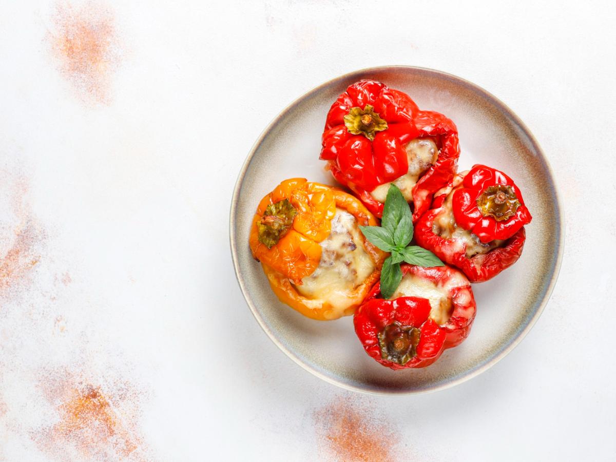 Фаршируйте запечённые половинки перцев смесью из булгура. Сверху выложите помидоры с базиликом. Подавайте тёплым, сразу после приготовления.