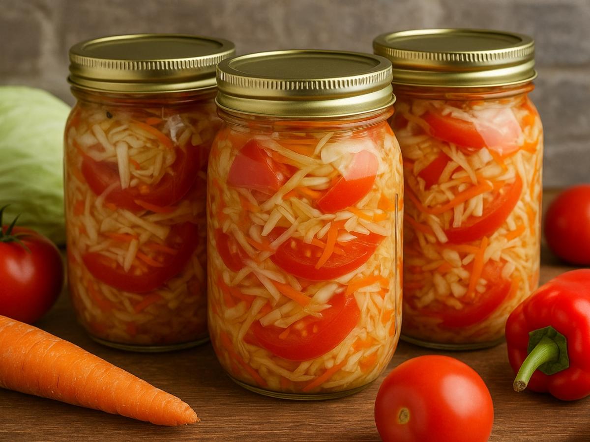 Зимой такую закуску можно подать прямо из банки — без заправки, просто в глубокой тарелке. Она хорошо сочетается с мясом, картофелем и кашами.