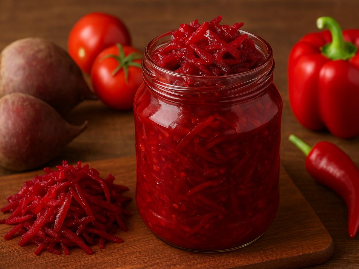 Эта острая свекла — универсальная заправка и закуска. Её можно добавить в борщ, чтобы сделать суп насыщенного цвета и придать ему пикантность, а можно подать к мясу или картошке вместо овощного салата. Готовая банка объёмом 0,5 литра займёт своё место в зимних запасах и станет отличным помощником на кухне.