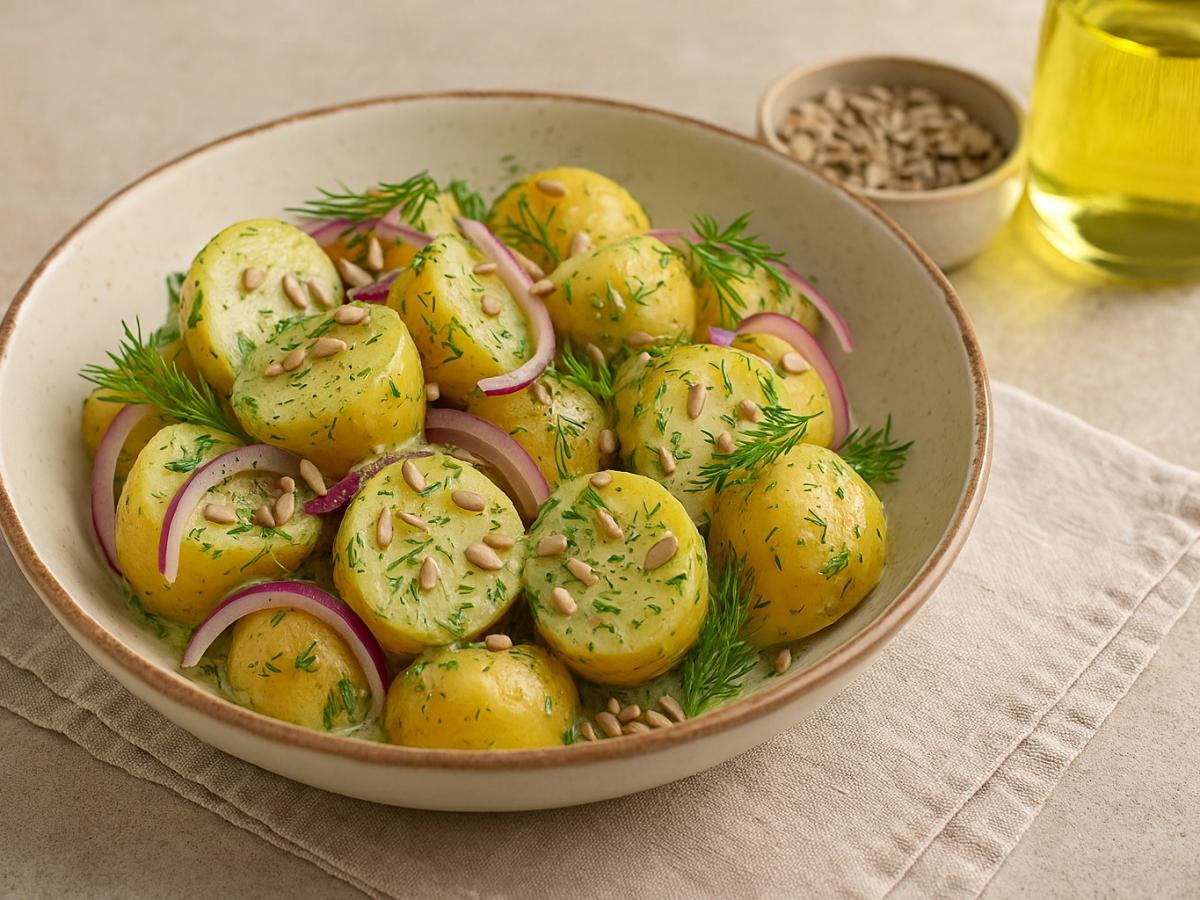 Салат из молодого картофеля с укропной заправкой — одно из тех блюд, где простота превращается в изысканность. Варёная молодая картошка и свежий укроп — классический союз, а нежная сметанная заправка с ароматным нерафинированным маслом и чесноком выводит вкус на новый уровень. Такой салат идеально подойдёт к летнему столу, станет отличным гарниром или лёгким ужином.