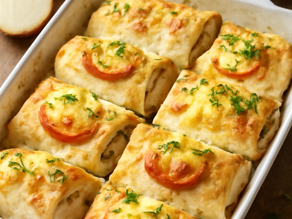 Для заливки смешайте оставшееся яйцо, ложку сметаны и натёртый сыр. Полейте этой смесью рулеты.
