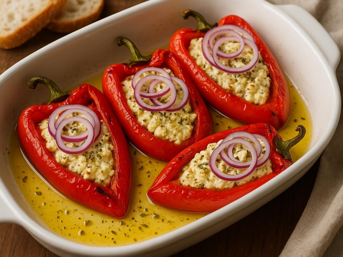 Перцы богаты витамином С, каротиноидами и клетчаткой, что делает закуску не только вкусной, но и полезной. Сыр добавляет белок и кальций, а также делает вкус более насыщенным. Чеснок и лук усиливают аромат, а орегано придаёт характерную "греческую" нотку. Поливка из оливкового масла не только улучшает текстуру, но и добавляет полезные жирные кислоты.