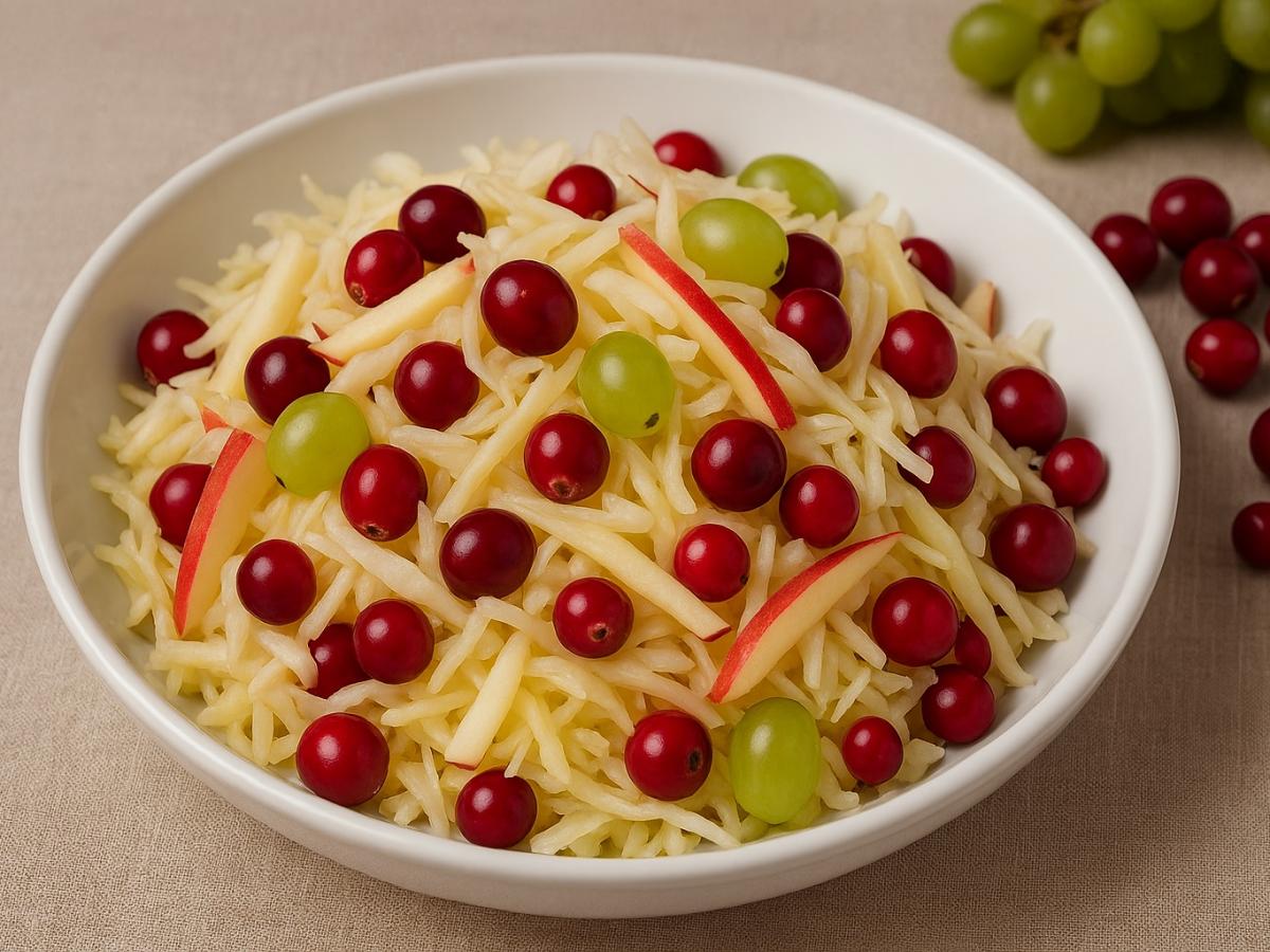 А если вместо клюквы взять изюм или сушёную вишню? Тогда вкус получится мягче и с более выраженной сладостью. А если добавить немного апельсиновой цедры, салат приобретёт цитрусовый аромат и станет праздничным акцентом на новогоднем столе.