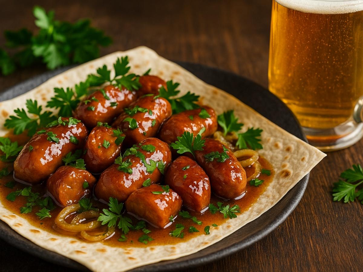 Колбаски сами по себе вкусные, но в пивном соусе они раскрываются совершенно иначе. Темное пиво придает лёгкую горчинку и плотный аромат, а светлое — мягкость и баланс. Горчица добавляет пикантности, а тростниковый сахар уравновешивает вкус.