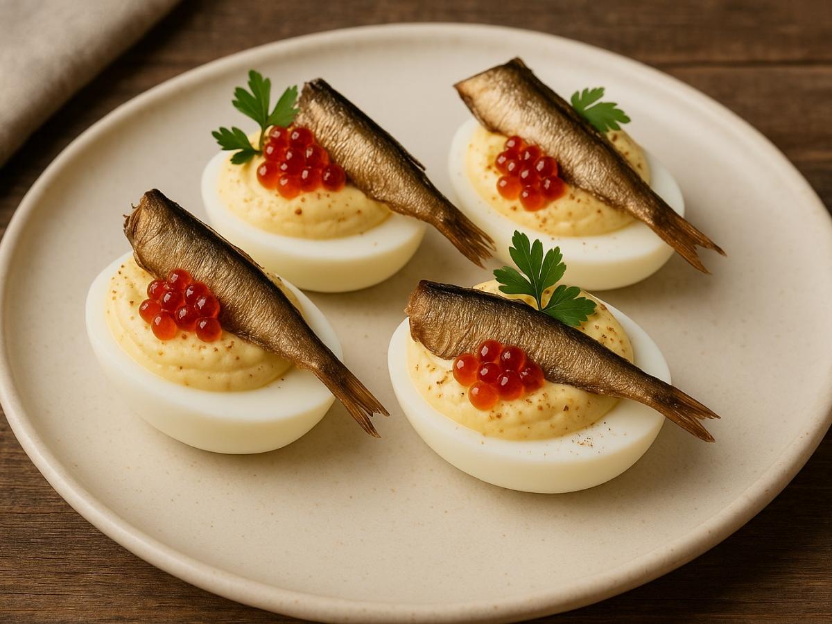 Фаршированные яйца с икрой и шпротами: желтковый крем с горчицей и паприкой, сверху шпроты и чуть икры; охладить 15-20 минут.