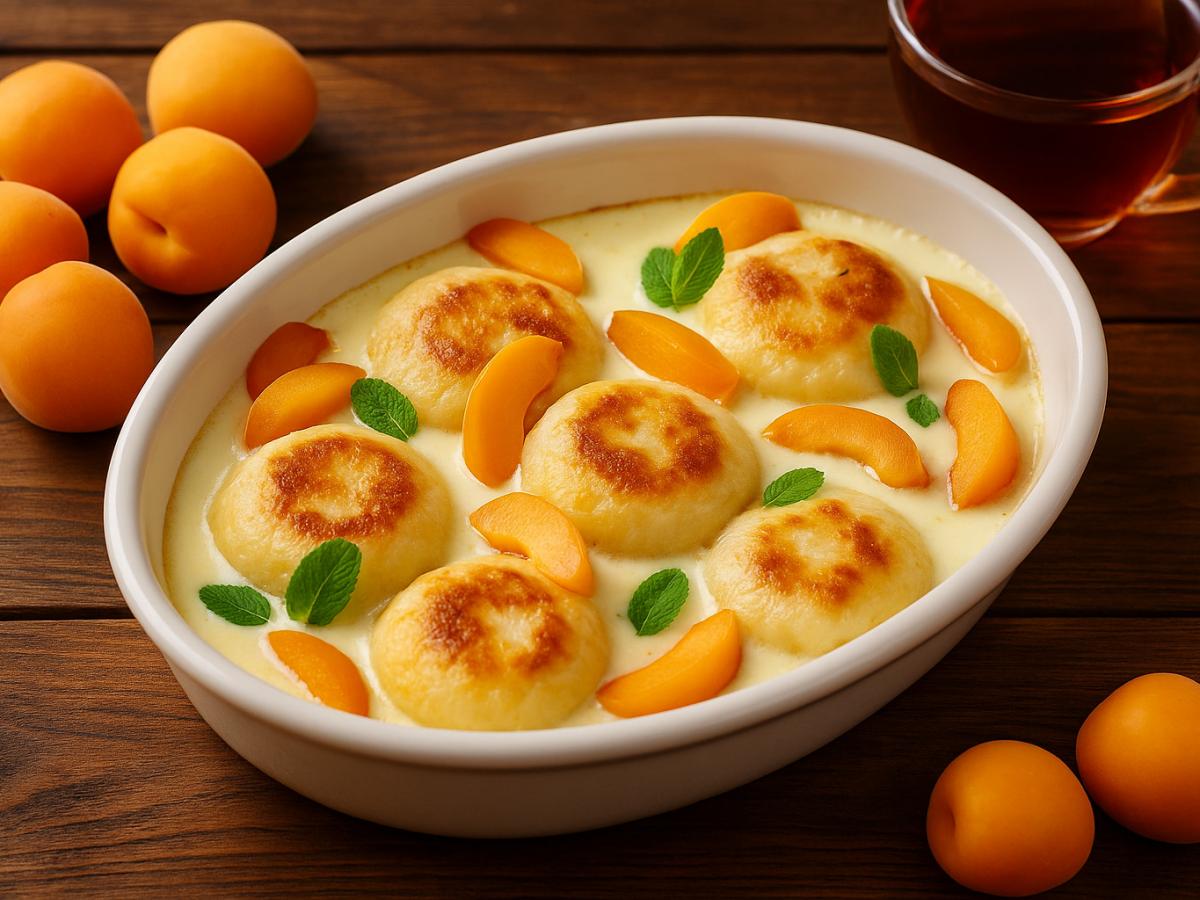 Лучше всего подавать сырники тёплыми, прямо из духовки — так они особенно нежные, а фрукты в заливке остаются сочными.