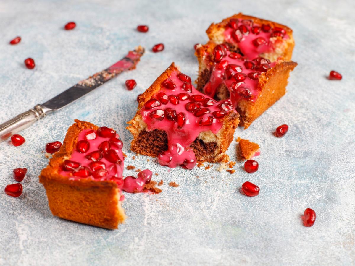 Остудите, нарежьте ломтиками, украсьте свежим гранатом.