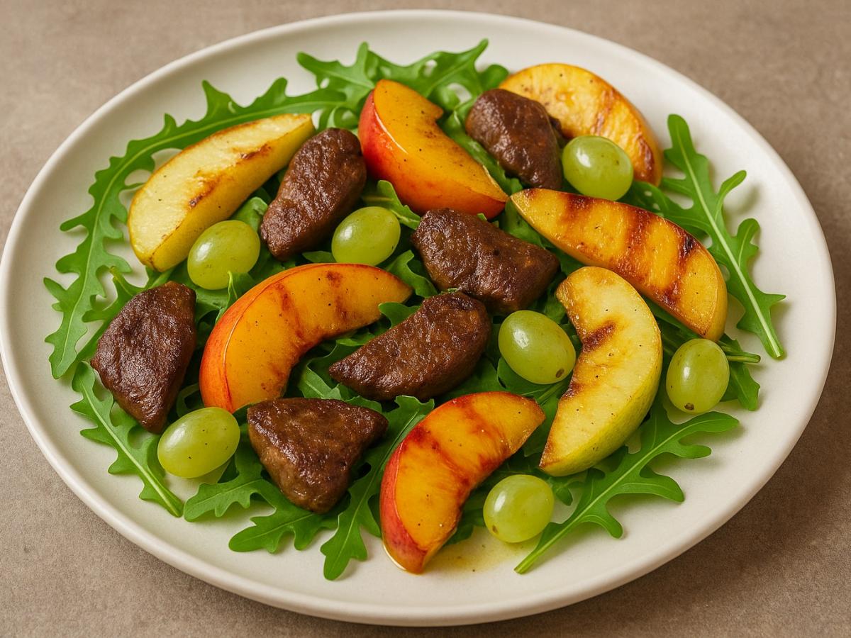 Главная идея этого салата — объединить тёплые фрукты и субпродукты. Печень, обжаренная до золотистой корочки, прекрасно сочетается с ароматными дольками груши, сладковатым персиком и лёгкой кислинкой винограда. Всё это дополнено щепоткой зиры, порошком карри и свежим апельсиновым соком, который связывает вкусы в единую композицию.