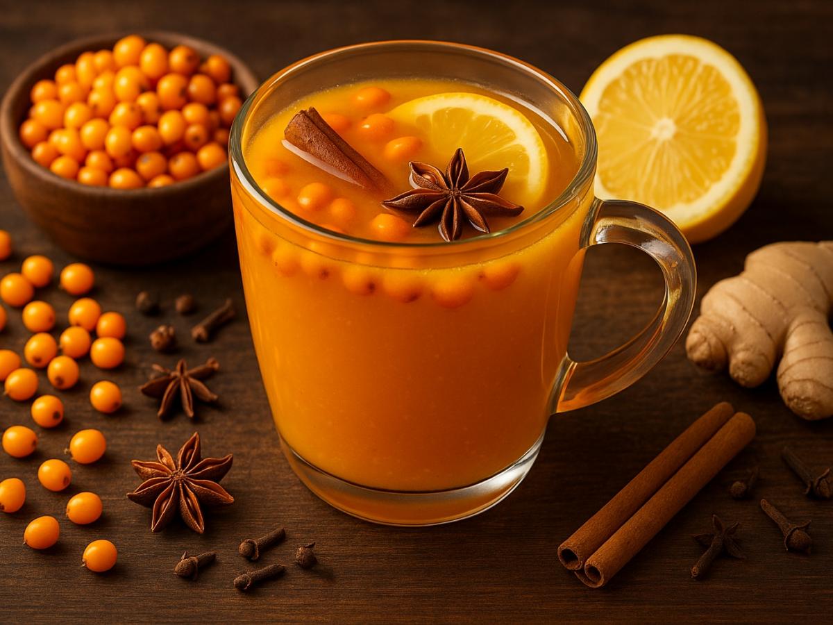 Облепиха — природный источник витамина С, каротина и антиоксидантов. Она помогает бороться с простудами и усталостью, а её кисло-сладкий вкус создаёт свежий контраст с цитрусовыми. Апельсин придаёт напитку лёгкую сладость и солнечный аромат, а лимон усиливает тонизирующий эффект.