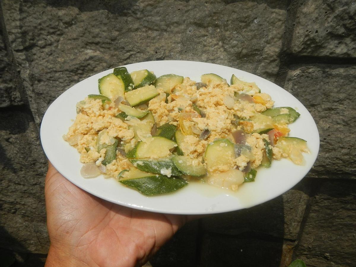 Получается сочное, ароматное блюдо — что-то среднее между омлетом и овощной запеканкой.