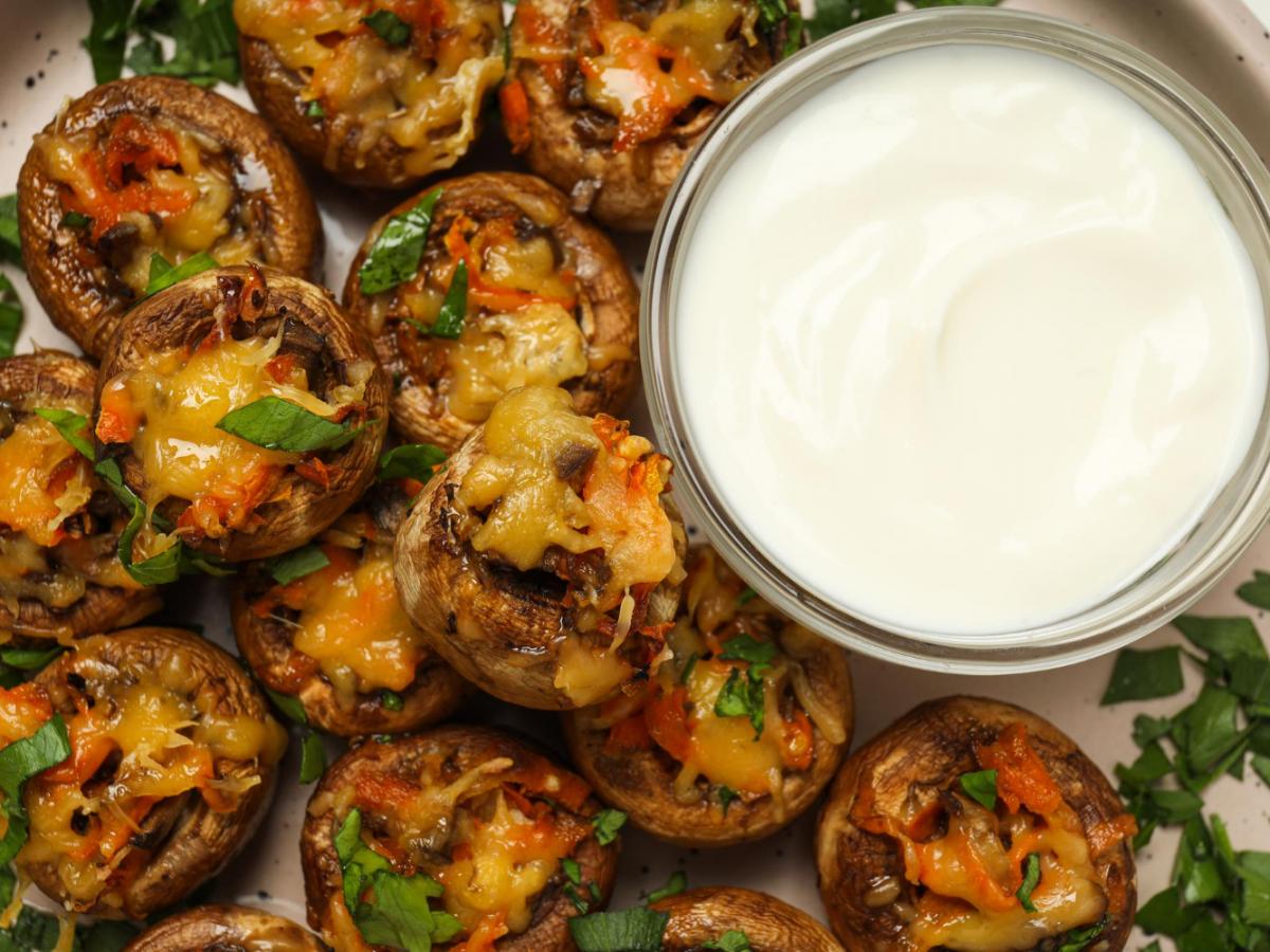 Эта закуска универсальна: подойдёт и к горячим блюдам, и как самостоятельный перекус. Попробуйте подать шампиньоны с: