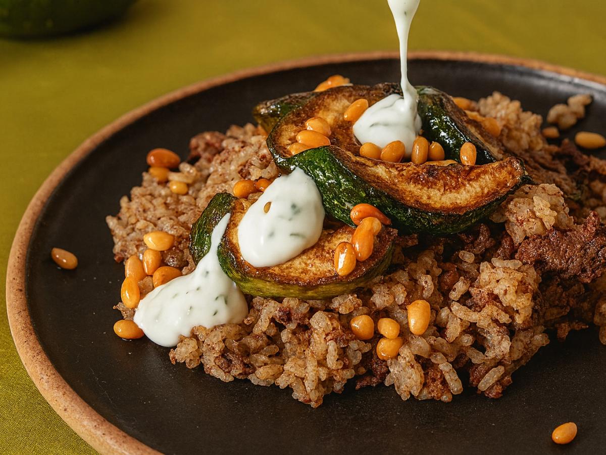 В оригинале используется специальный инструмент, с помощью которого выдалбливают сердцевину овощей. В России таких приборов почти нет, поэтому рецепт адаптировали: вместо фарширования ингредиенты готовят отдельно и соединяют слоями — пряный рис с мясом внизу, обжаренные огурцы сверху, а затем соус и кедровые орешки.
