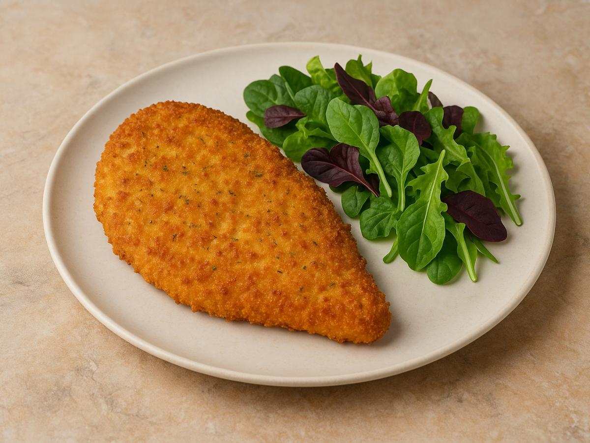 Шницель можно приготовить из куриной грудки — она также диетическая и нежная. Важно не пересушить мясо, иначе оно потеряет сочность. Альтернативой станут филе кролика или телятина: оба варианта сохраняют мягкость при запекании.
