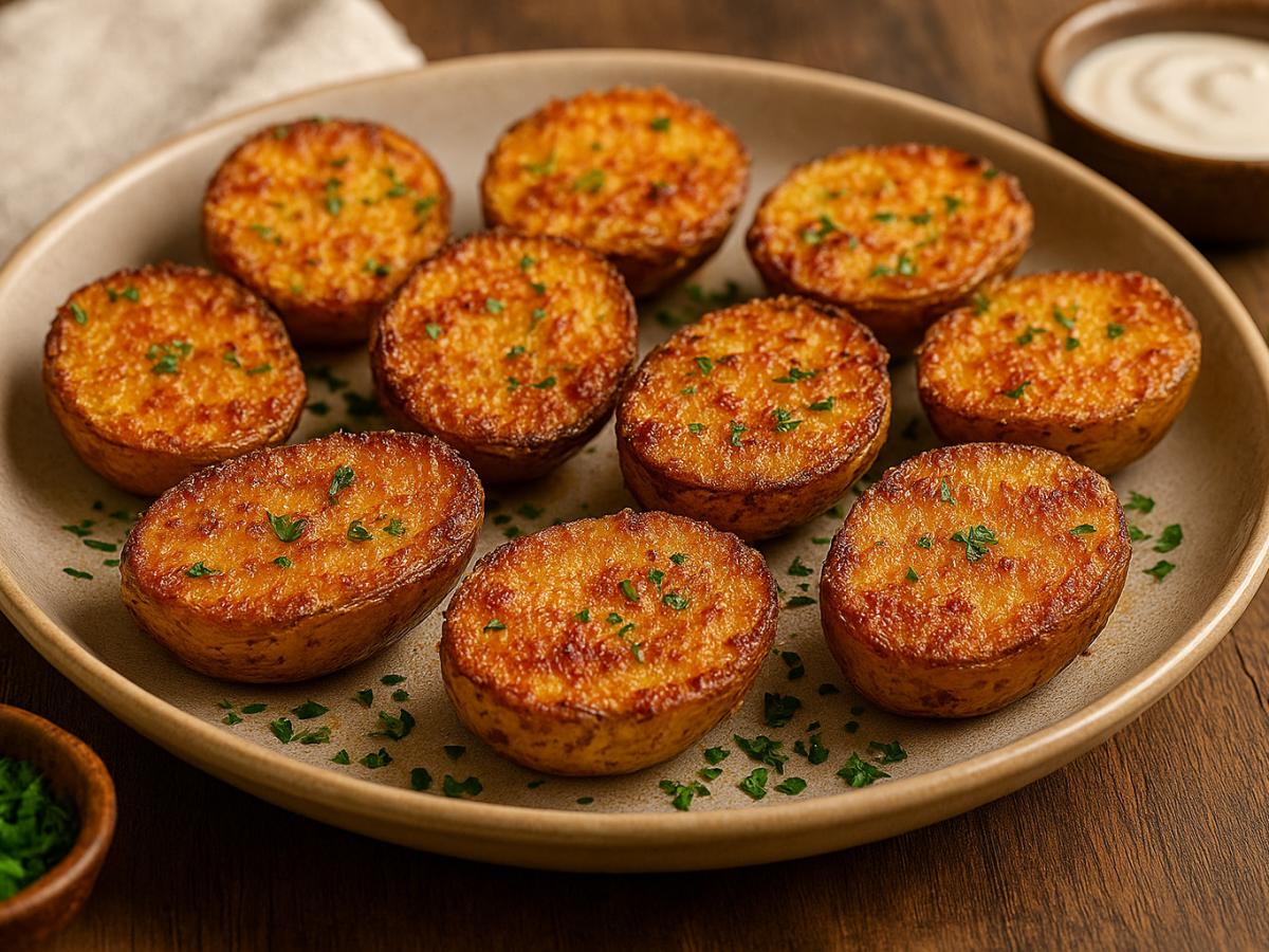 На плоскую тарелку насыпьте оставшийся пармезан. Обмакните срез каждой половинки картофеля в сыр и верните их в форму, уложив срезом вниз. Так сыр запечётся ровным слоем и образует золотистую корочку.