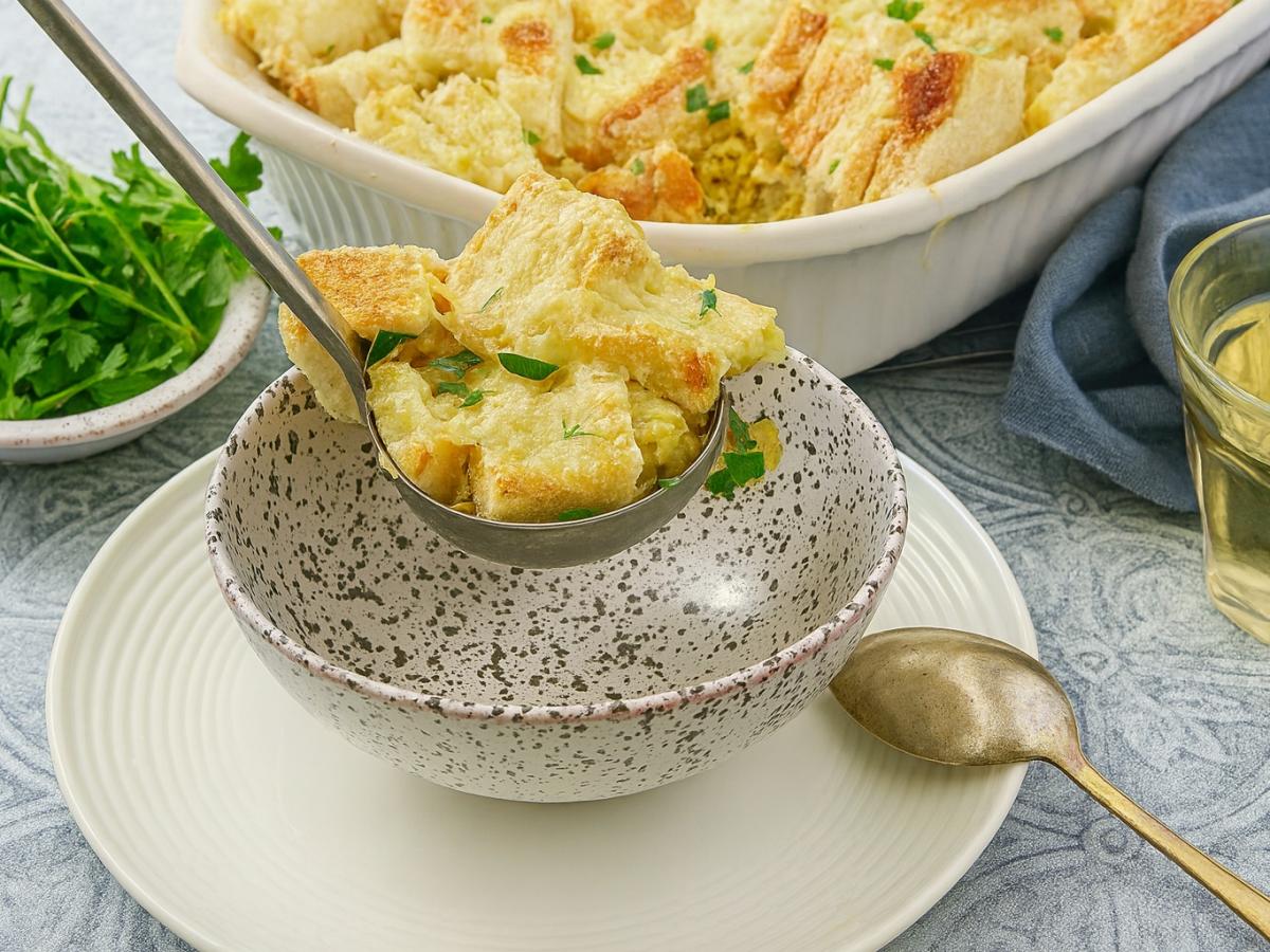Сборка. В форму для запекания выложите слой капустного супа, сверху — хлебные кубики. Повторите, пока не закончатся ингредиенты. Слегка прижмите, чтобы хлеб впитал бульон.