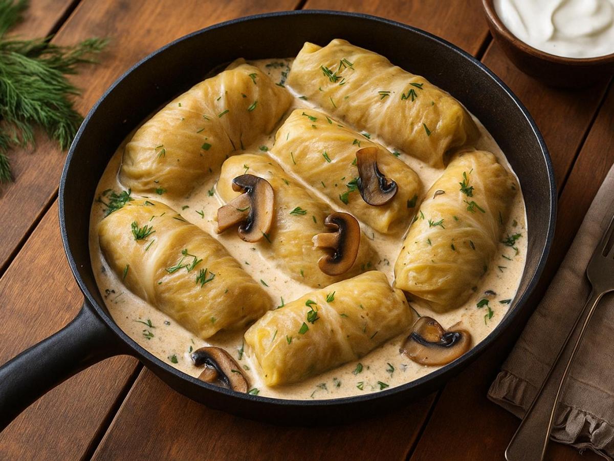 Отварите рис, смешайте с обжаренными грибами и зажаркой. Заверните начинку в листья капусты, залейте соусом и тушите 30 минут.