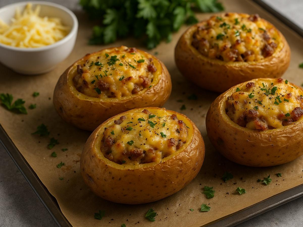 Если хочется сделать блюдо основным, добавьте в начинку фарш — куриный, говяжий или индюшиный. Можно добавить немного томатной пасты или сливок для сочности. Запеките фаршированный картофель 10-15 минут при 200 °C, чтобы начинка схватилась и покрылась аппетитной корочкой.