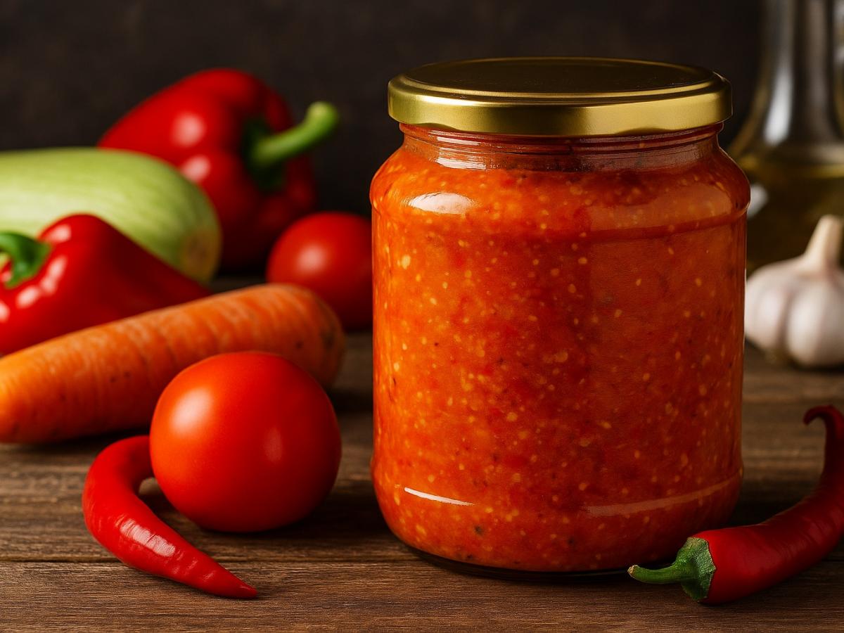 Именно кабачки делают заготовку мягче, при этом не лишая её насыщенности. Классический состав включает болгарский и острый перец, морковь, чеснок, помидоры, растительное масло, сахар, соль и немного уксуса — для естественной консервации и приятной кислинки.