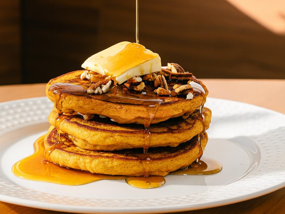 Миф: тыквенные блинчики всегда приторные. Правда: всё решает топпинг и пюре без сахара, кленовый сироп подавайте отдельно.
