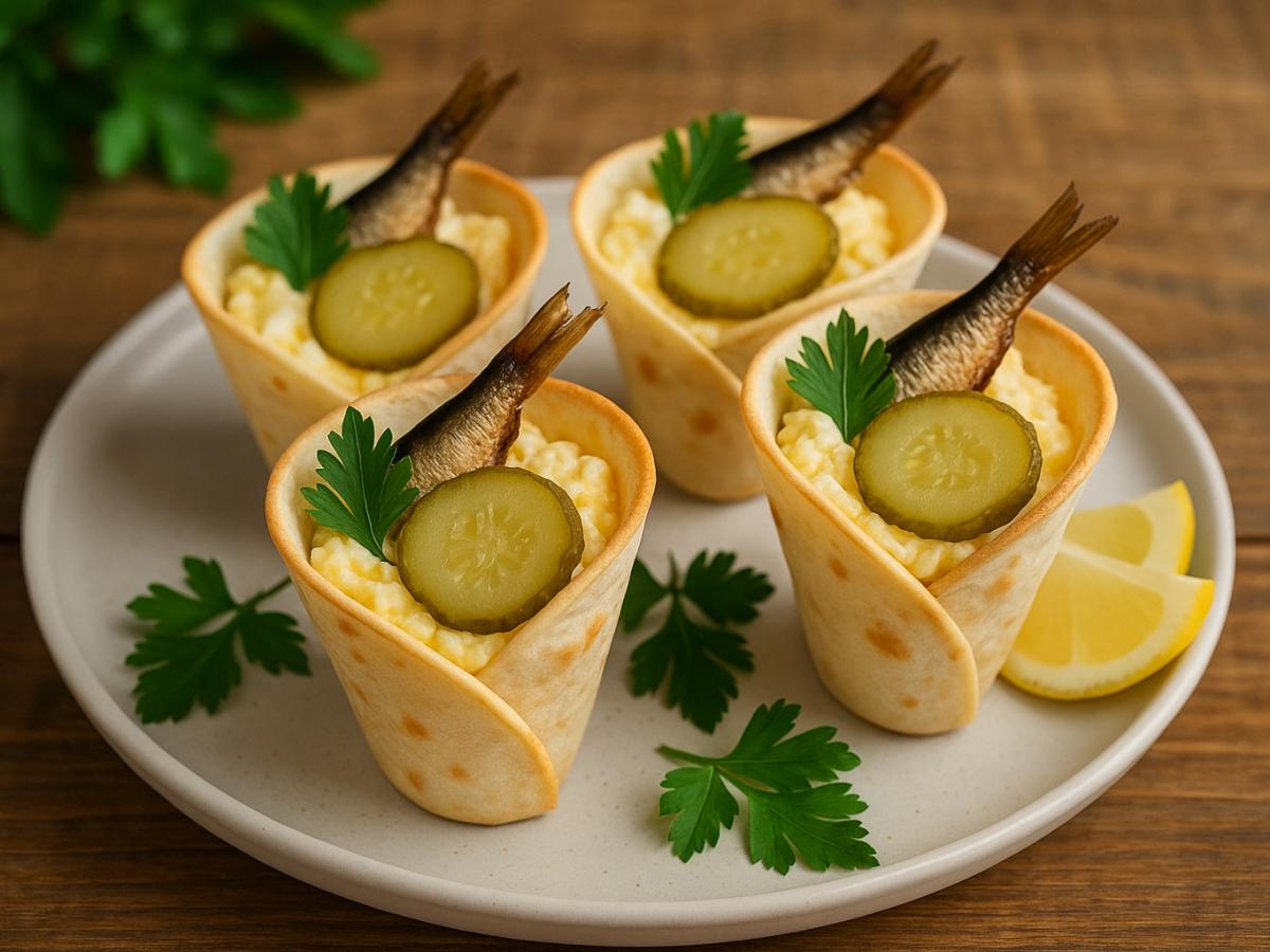 В основе рецепта — салат из варёных яиц, плавленого сыра и чеснока. Он выполняет роль мягкой, но плотной "подушки", удерживающей более крупные ингредиенты — ломтики маринованных огурцов и шпроты. Вместо теста для тарталеток используется тортилья: тонкая лепёшка из пшеничной муки, которая легко принимает форму рожка при запекании. Такой формат не только выглядит эффектно, но и остаётся доступным по цене.
