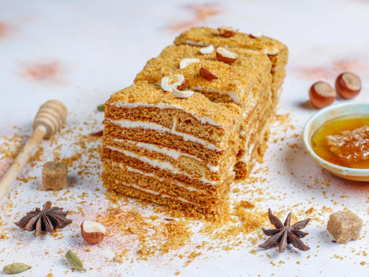 Мед карамелизуется в духовке и усиливает аромат коржей.