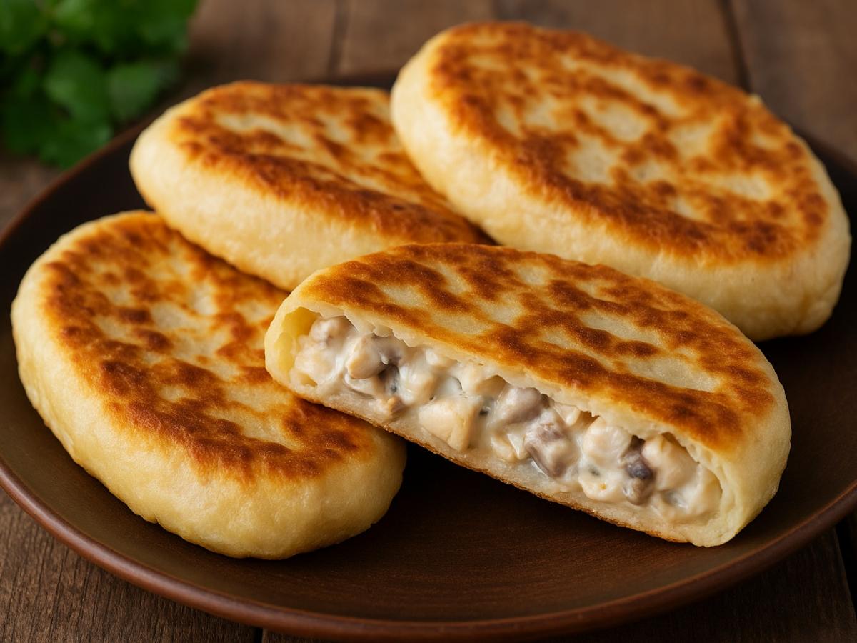 Если хочется приготовить что-то вкусное, но без долгого стояния у плиты, кефирные лепёшки с курицей и грибами — идеальное решение. Они получаются мягкими, румяными и очень ароматными, а внутри скрывается сливочная начинка с сыром. Блюдо сочетает простоту домашней выпечки и насыщенность ресторанного вкуса.