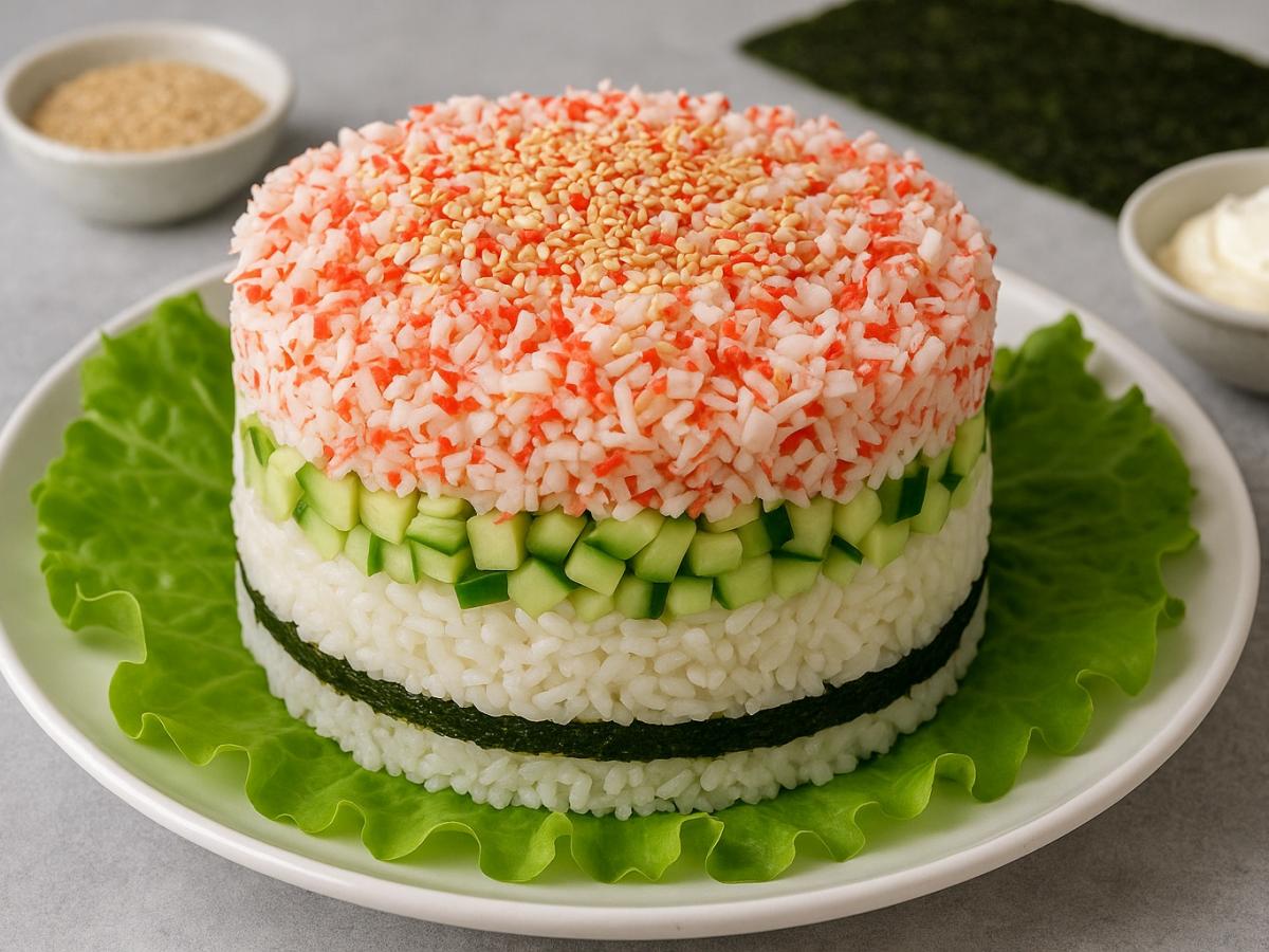 Суши-торт с крабовыми палочками — одна из тех закусок, которые выглядят эффектно, но готовятся без особых усилий. Это вариация классических суши, собранных в виде торта, который удобно подавать на большом блюде. Он подходит для ужина, посиделок с друзьями или праздничного стола. Главный секрет — качественные крабовые палочки и правильная работа с рисом: от этого зависит вкус и текстура.