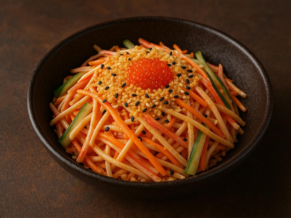 Секрет японского кани-салата в том, что каждый ингредиент играет свою роль. Хруст огурца и моркови оттеняет нежность крабовых палочек, а воздушные сухари панко добавляют лёгкости. Тёплые нотки кунжута и солоноватая икра тобико делают вкус многослойным — без излишней тяжести, но с характером.