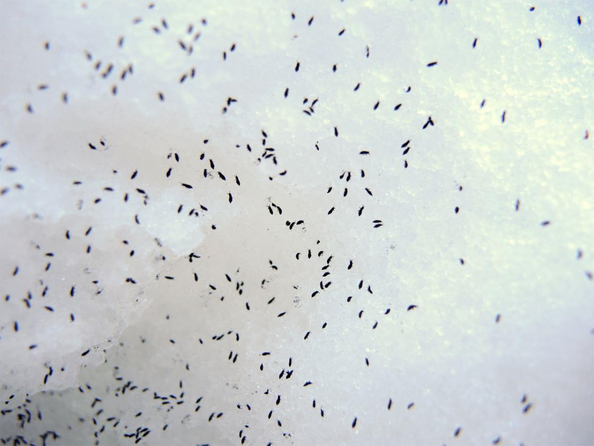 "Глетчерная блоха — членистоногое из класса ногохвосток (коллембол). Весной, когда температура на улице повышается, но не доходит до отметки 12 градусов, эти крошечные создания образуют большие скопления на снегу", — рассказал он.