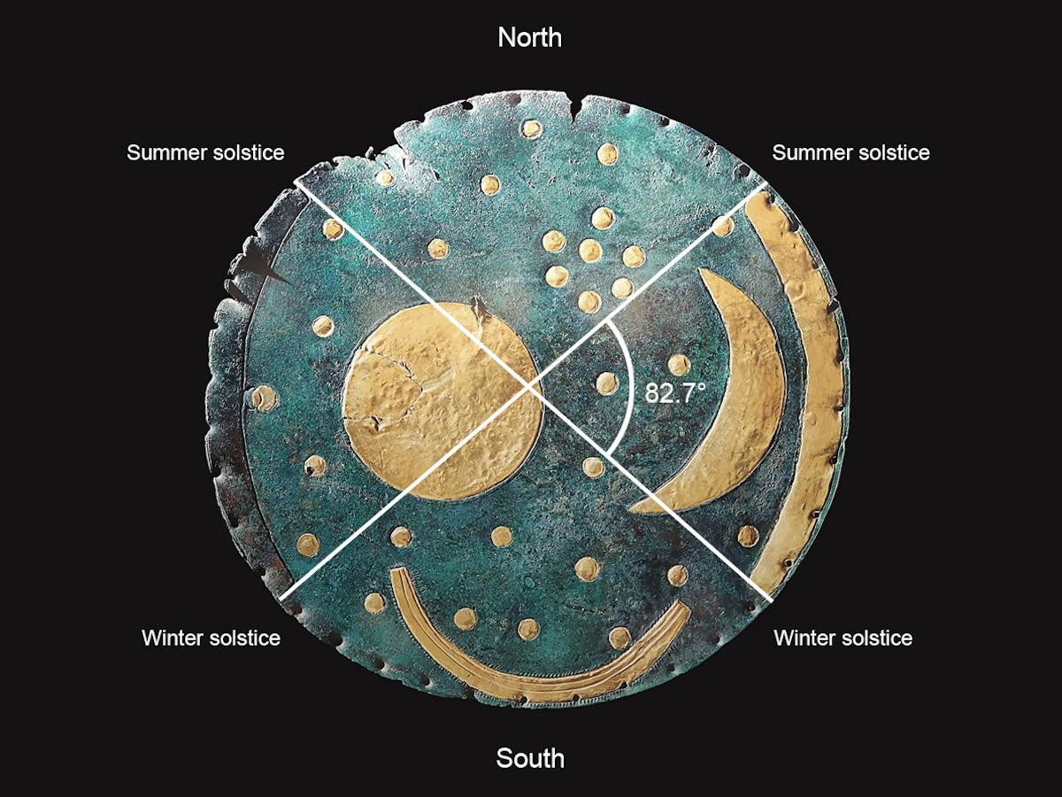 Диск украшен золотыми фигурами, изображающими солнце, луну, звёзды и, возможно, Плеяды — звёздное скопление, которое использовалось для определения смены времён года. Также на диске можно увидеть изображение горизонта и предположительно солнечной лодки.