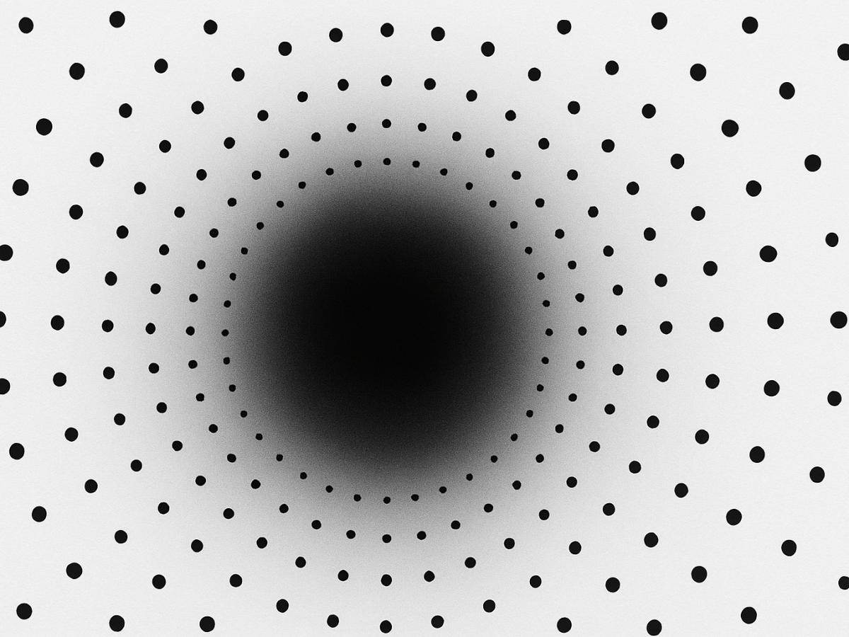 Перед нами простой белый фон с черными точками и размытым пятном в центре. Стоит задержать взгляд на этом "отверстии", и мозг интерпретирует его как тоннель, будто зритель движется вперёд. В ответ зрачки начинают расширяться, готовясь к темноте. Это рефлекс, обычно запускающийся лишь при реальном снижении освещённости.