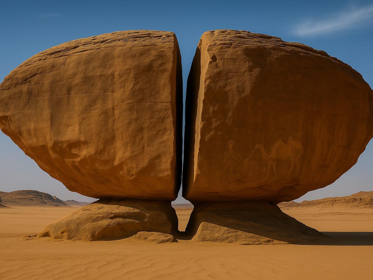 В самом сердце саудовской пустыни, недалеко от древнего города Тайма, стоит загадочная скала, разделённая ровным, почти ювелирным разрезом. Две половины монолита выглядят так, словно кто-то аккуратно рассёк их гигантской пилой или лазером. Этот феномен, известный как Аль-Наслаа, до сих пор вызывает бурные споры среди геологов, археологов и любителей тайн древнего мира.
