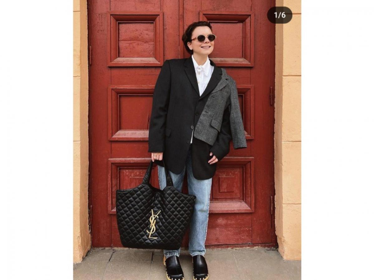 Жена юмориста вышла в свет в пиджаке замысловатого кроя. На первом пиджаке оверсайз красовался совсем маленький пиджак так, как будто его случайно пришили к одежде.