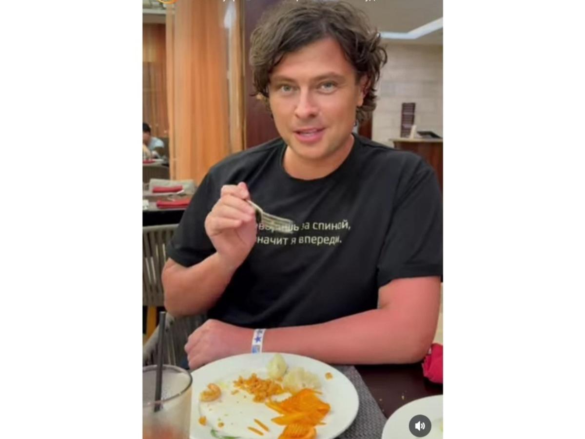 "Друзья мои, я на диете, как видите, ем как птичка, совсем мало. Смотрите, чуть-чуть поклевал овощей", — сказал артист на камеру.