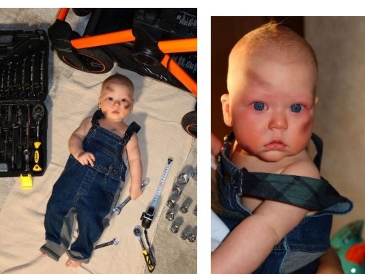 Мария нарядила наследника в джинсовый комбинезон, дала ему в руки гаечный ключ и перепачкала лицо наследника чем-то тёмным.